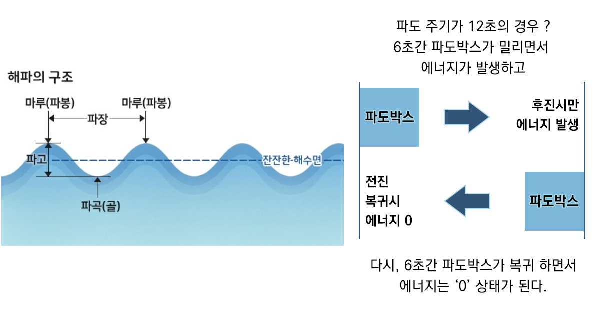 해안으로 밀려 오는 파도에 의해 “파도 박스” 가 뒤로 밀리면서 발생하는 에너지의 50%는 발전기를 회전시켜 전기를 생산함과